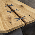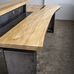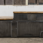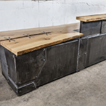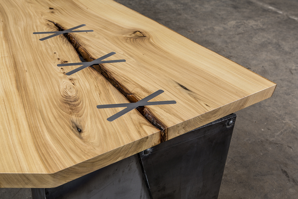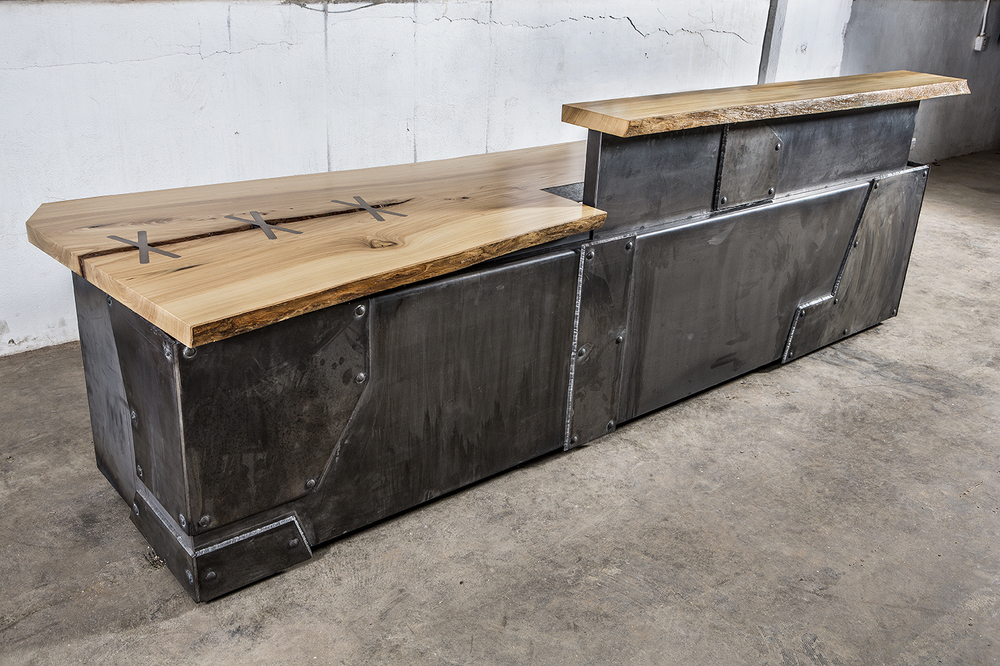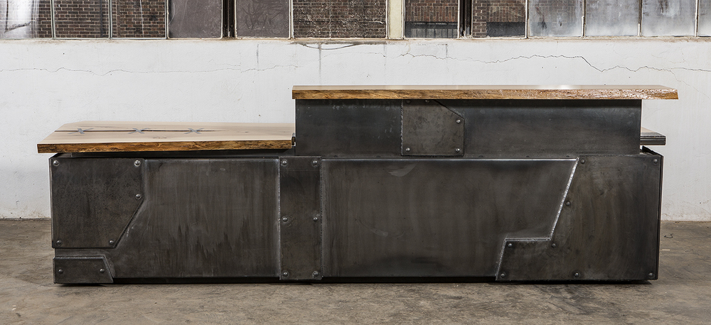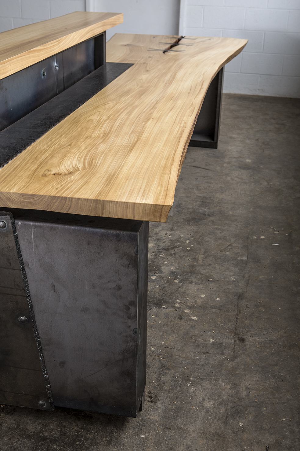Welded steel with detail rivets. Mounted with locally sourced Elm slab and polished to a velvety