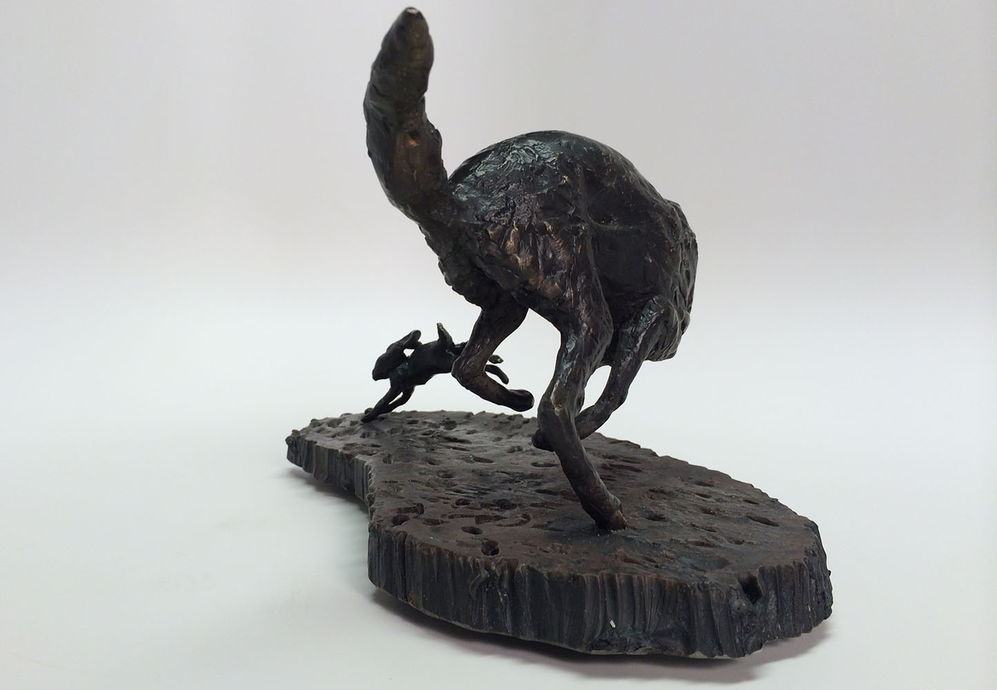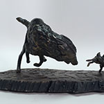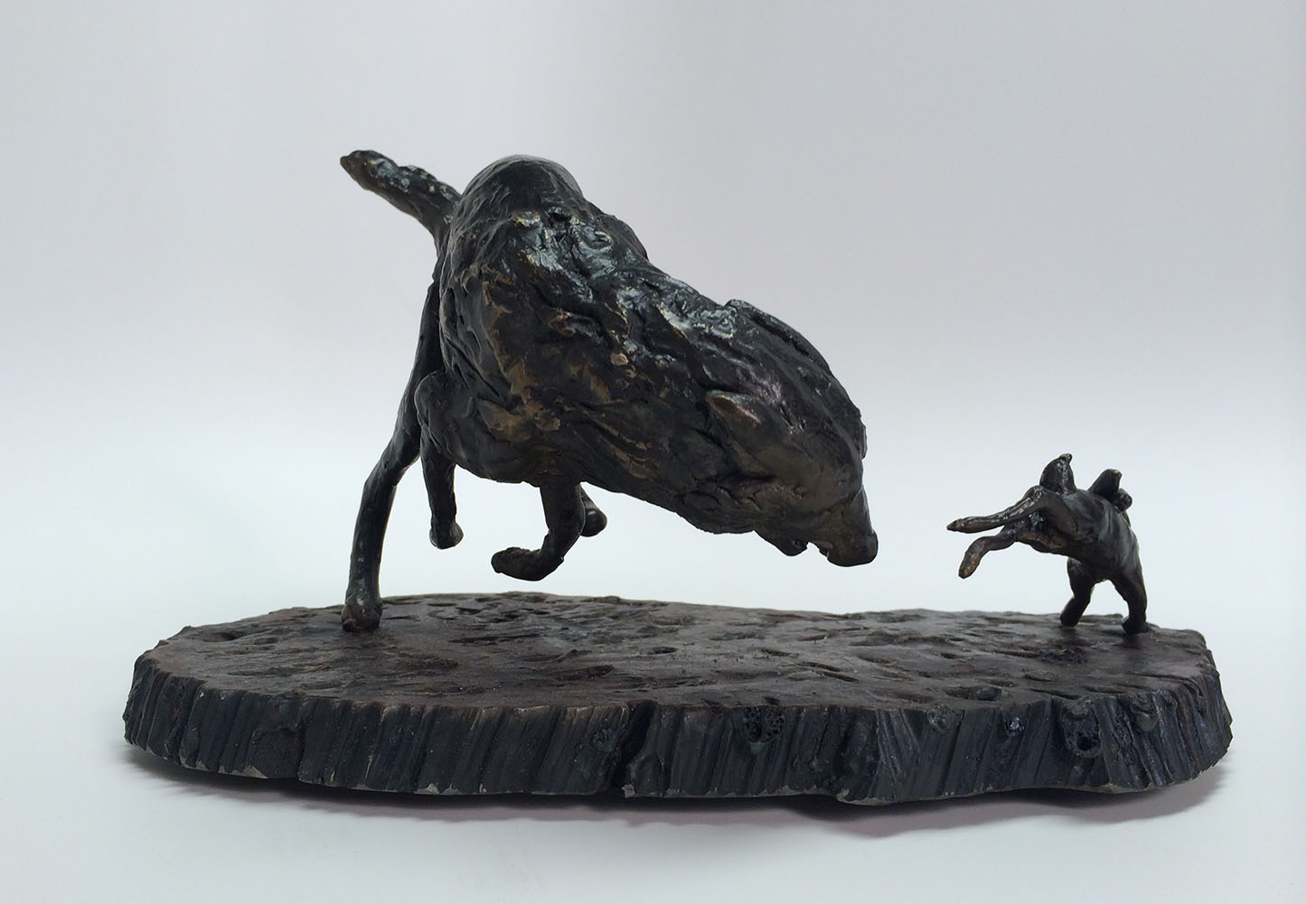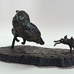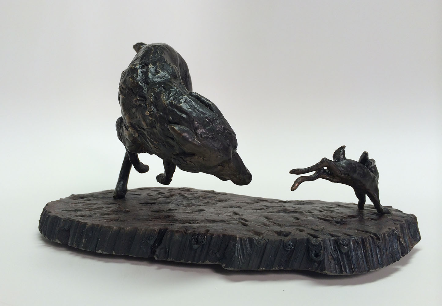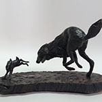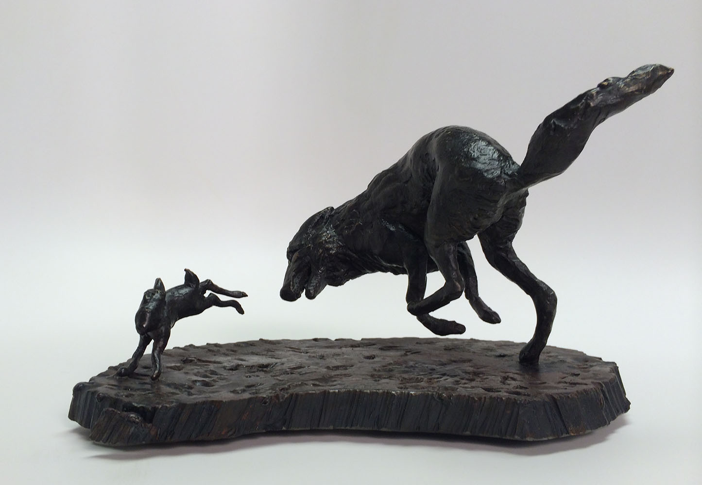 This sculpture is one of a series depicting The Hunt. As the rabbit banks right the wolf is caught off balance,